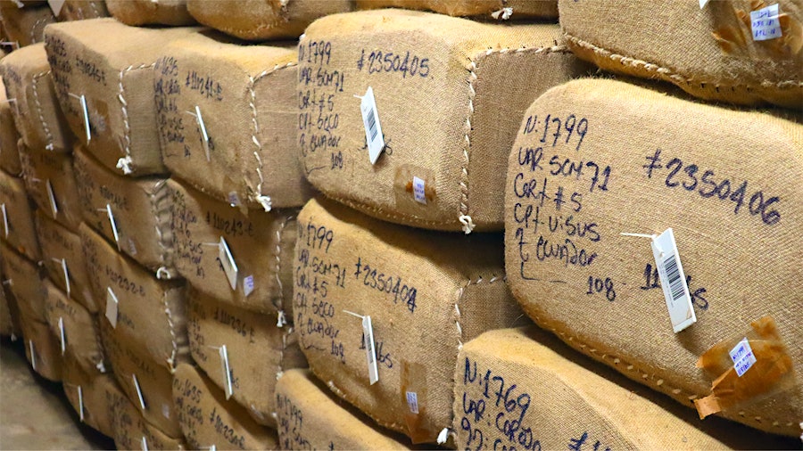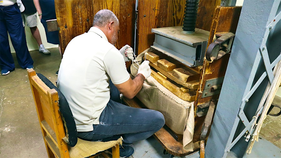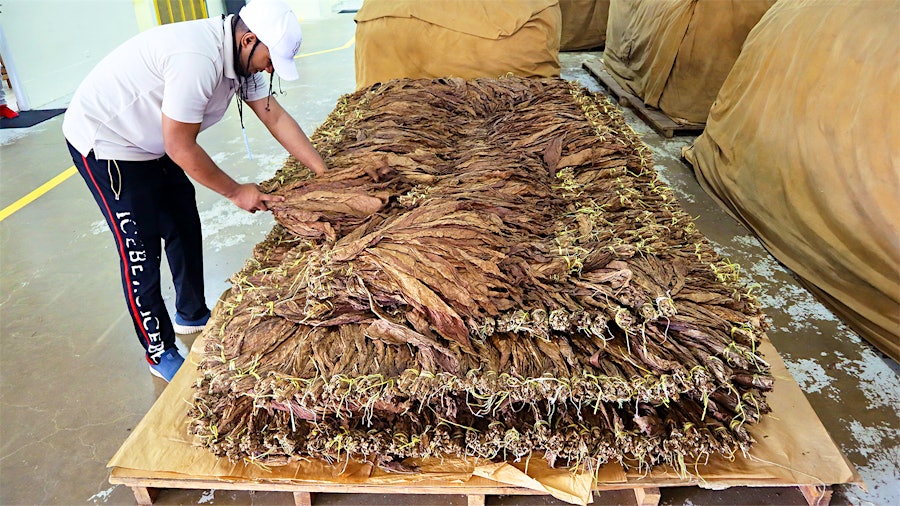 Thuốc lá được ép thành khối và bọc trong lớp vải bố để bước vào giai đoạn “ngủ” dài hạn. Một công nhân nhà máy may kín các mép và chuyển kiện lá này đến khu lưu trữ để tiếp tục ủ.