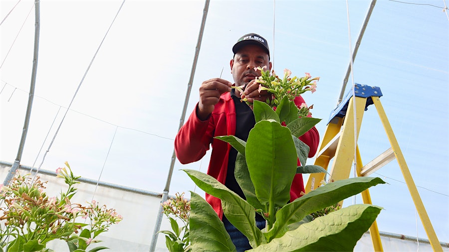 Một chuyên gia nông học tại cánh đồng thực hiện thụ phấn chéo cho hoa thuốc lá. Đây là bước quan trọng trong quá trình phát triển hạt giống mới.