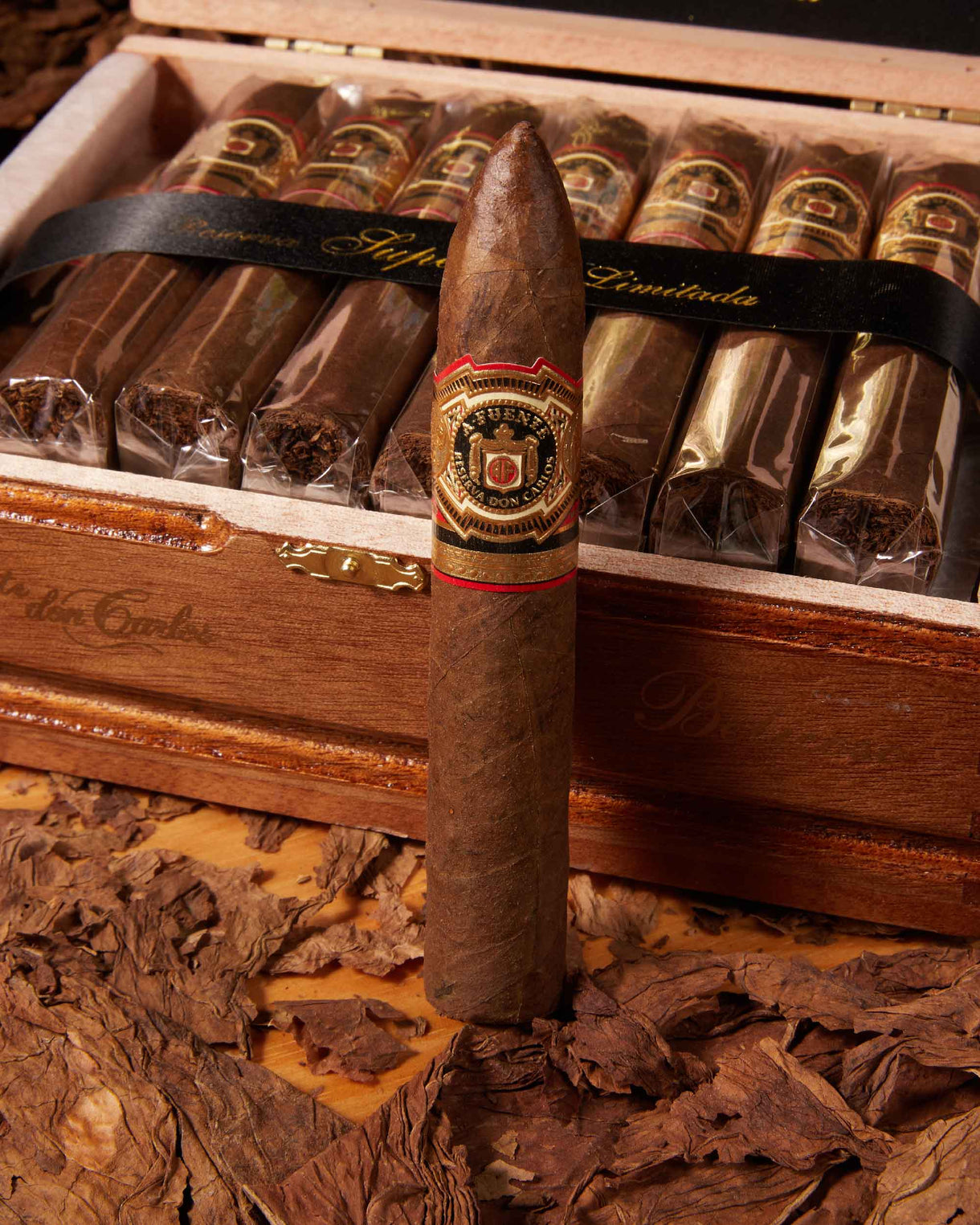 Hộp gỗ cổ điển, in logo Fuente và chữ vàng sang trọng. Band đỏ–đen–vàng đặc trưng Don Carlos. Điếu Torpedo đầu nhọn, wrapper Cameroon mịn, màu nâu đỏ sáng, nhiều dầu tự nhiên.