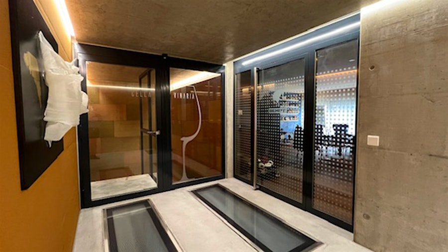 Cửa phòng được thiết kế giống hộp Behike với họa tiết Taino đặc trưng, bên cạnh lối dẫn vào hầm rượu vang.