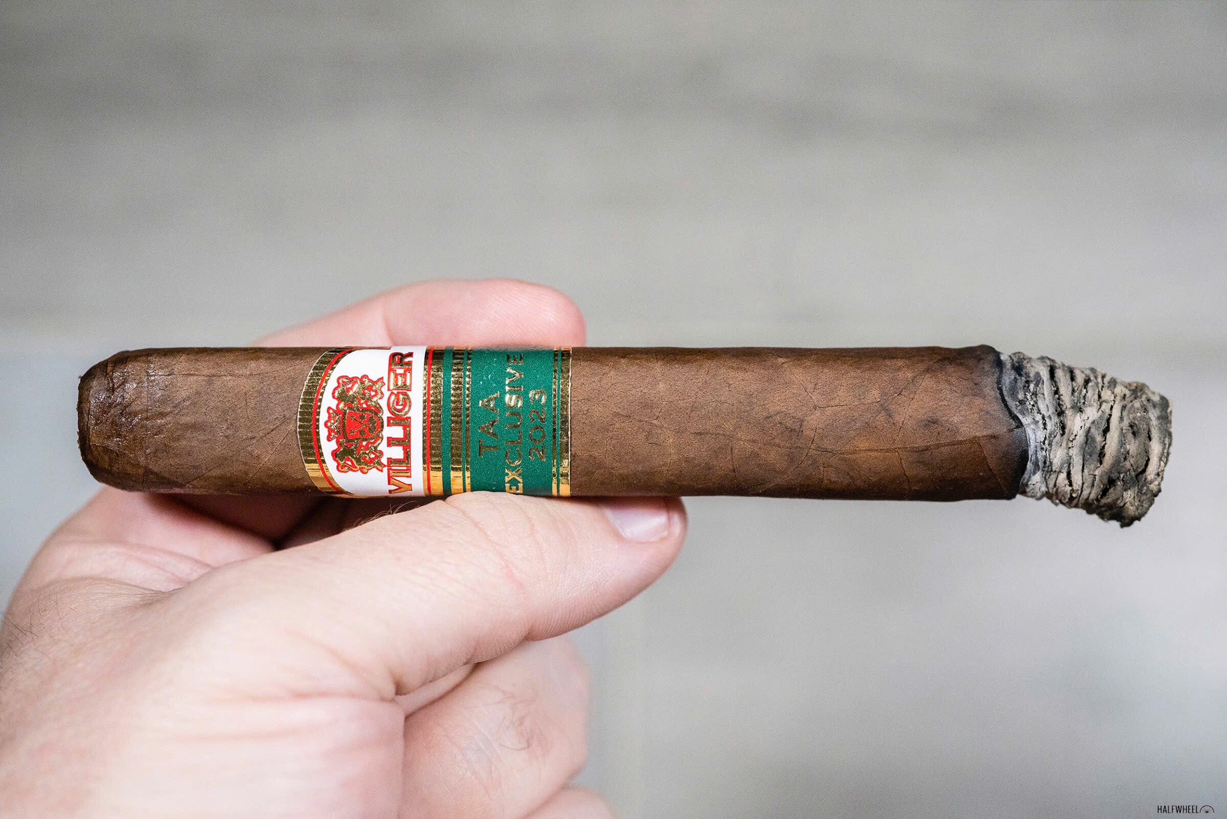 Điếu box-pressed chắc tay, wrapper nâu trung bình và band phụ “TAA Exclusive 2023” xanh nổi bật trên nền Villiger truyền thống.