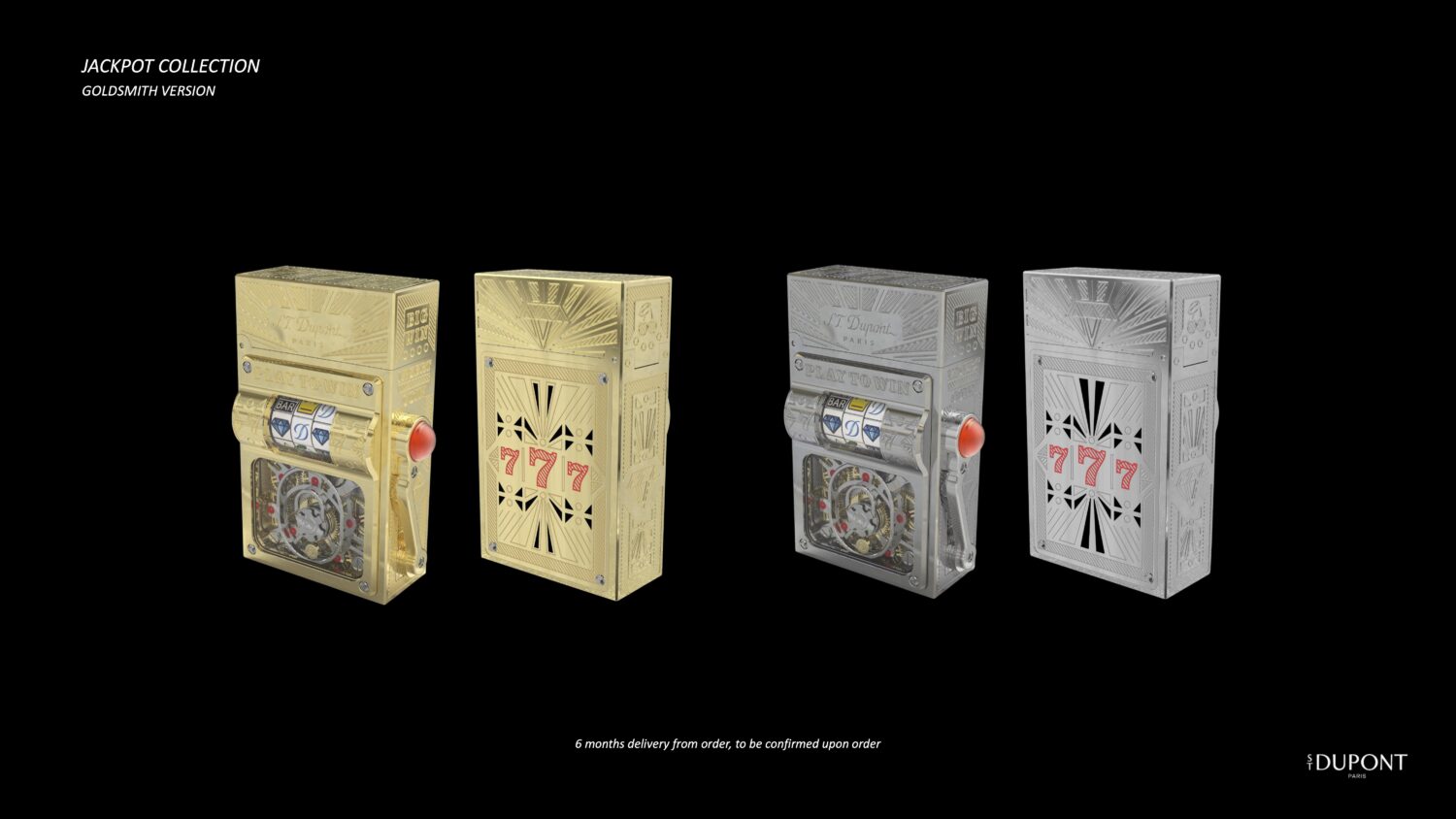Trong vài năm gần đây, S.T. Dupont liên tục kết hợp nghệ thuật chế tác bật lửa với cơ khí đồng hồ để tạo ra dòng sản phẩm Haute Création lấy cảm hứng từ thế giới casino. Sau các mẫu Casino (rulette quay) và Lucky Skull (đi kèm ba viên xúc xắc mini), thành viên mới nhất của bộ sưu tập là Haute Création Jackpot – một chiếc bật lửa tích hợp slot machine hoạt động thực sự, có giá gần 70.000 USD.