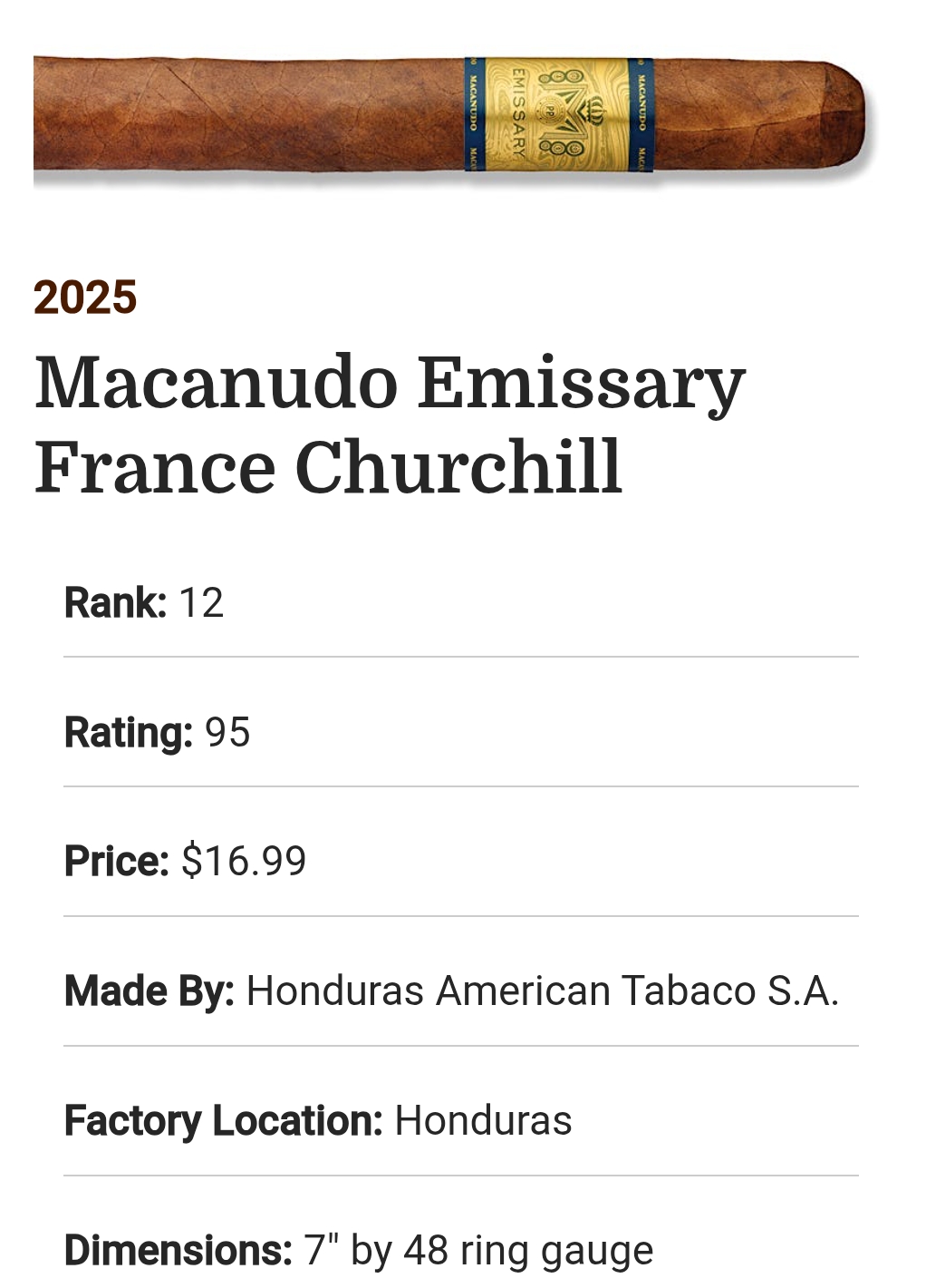 Macanudo Emissary France Churchill (Top 12 Cigar 2025): Tobacco Pháp & vị da thuộc – tiêu đen…